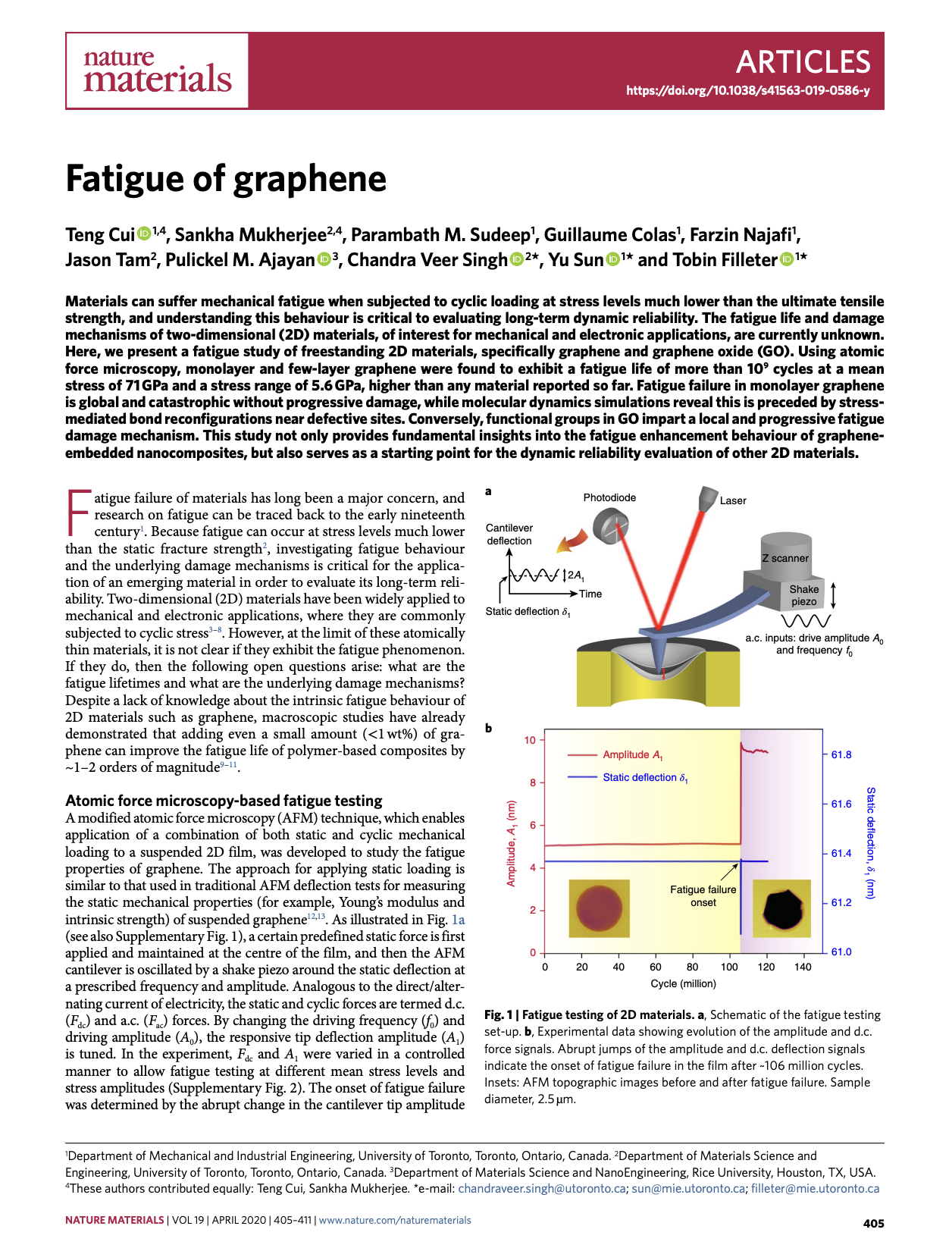 5. T. Cui, S. Mukherjee#, P.M. Sudeep, G. Colas, F. Najafi, J. Tam, P.M. Ajayan, C.V. Singh, Y. Sun and T. Filleter, Fatigue of graphene, Nature Materials, 19 (2020) 405-411.